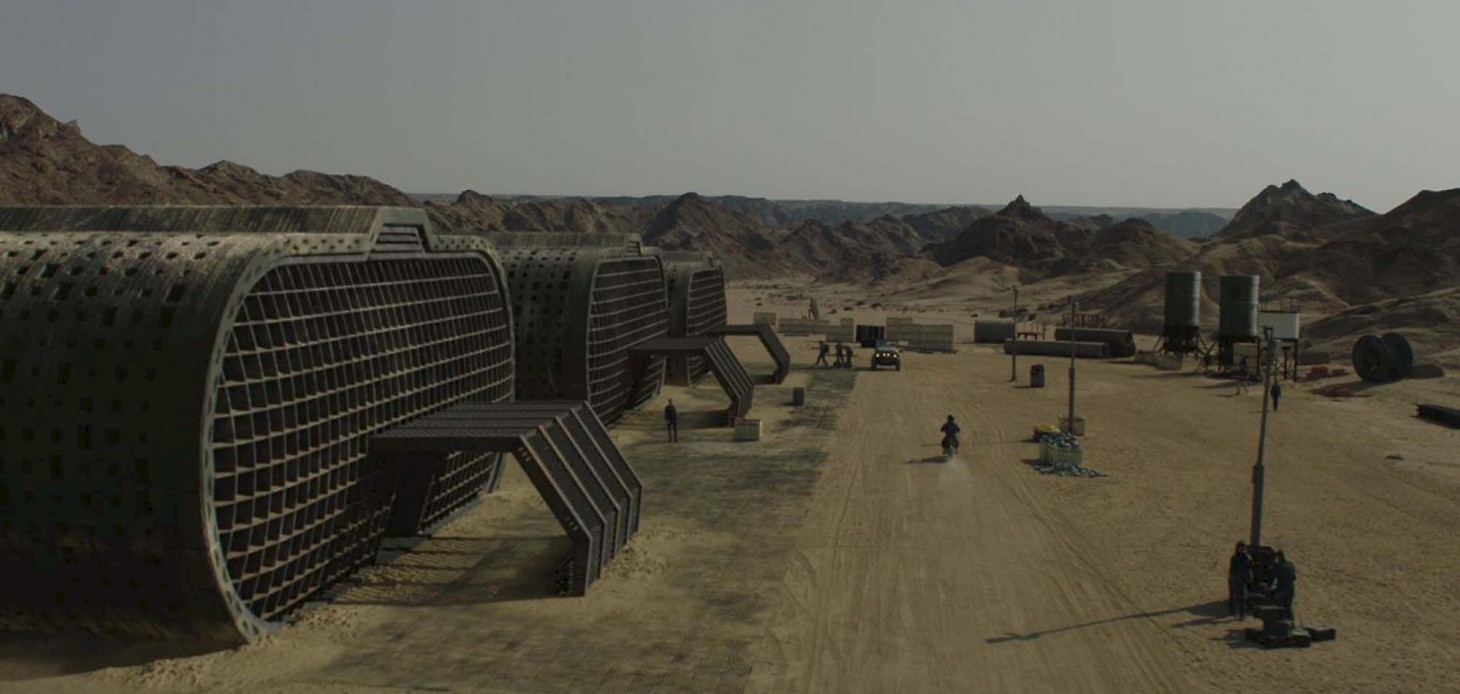 Leigh awakes to the aftermath and our first glimpse of ‘Oasis’ reveals itself as an arid and barren landscape (filmed in the Namibian desert). There was a partial set build (half of the front of the central pod) surrounded by green screens, but the vast majority was built by the team along with surrounding machinery, props, a landing pad, monitoring drones, moon craters and a CG City in the distance.